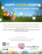 Join us for our annual Easter Egg Hunt at Carriage Inn! Festivities will take place outdoors in our main courtyard and feature a spring photo backdrop, pictures with the Easter Bunny, special prizes, and hundreds of Easter eggs waiting to be found! Children of all ages are invited to participate in this FREE community event. Refreshments will be served. RSVP by April 1 For more information, please contact Kennedy Thompson 979-216-7228 | kthompson@cardinalbay.org